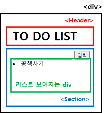 우선, 모든 내용을 감싸는 <div>, 제목을 나타내는 <header>, 실질적인 내용이 담기는 <section> 태그를 사용해서 뼈대를 잡았다.
