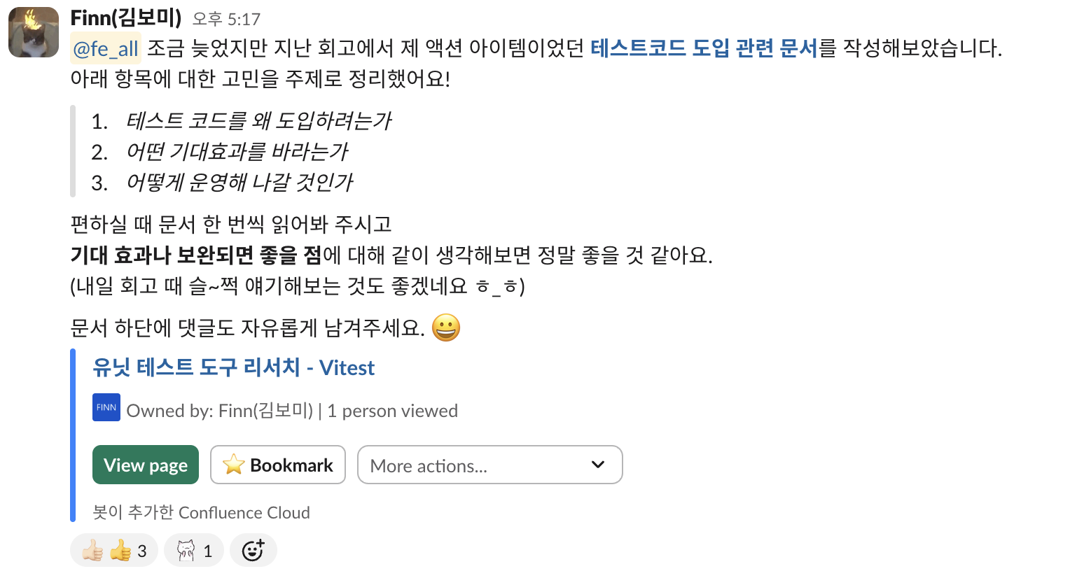 또, 팀장님뿐만 아니라 나의 고민과 테스트 코드 도입에 대한 확신을 팀원들과 공유하기 위해 문서를 작성했고, 함께 고민하고 의견을 나누는 문화를 만들고자 했다.