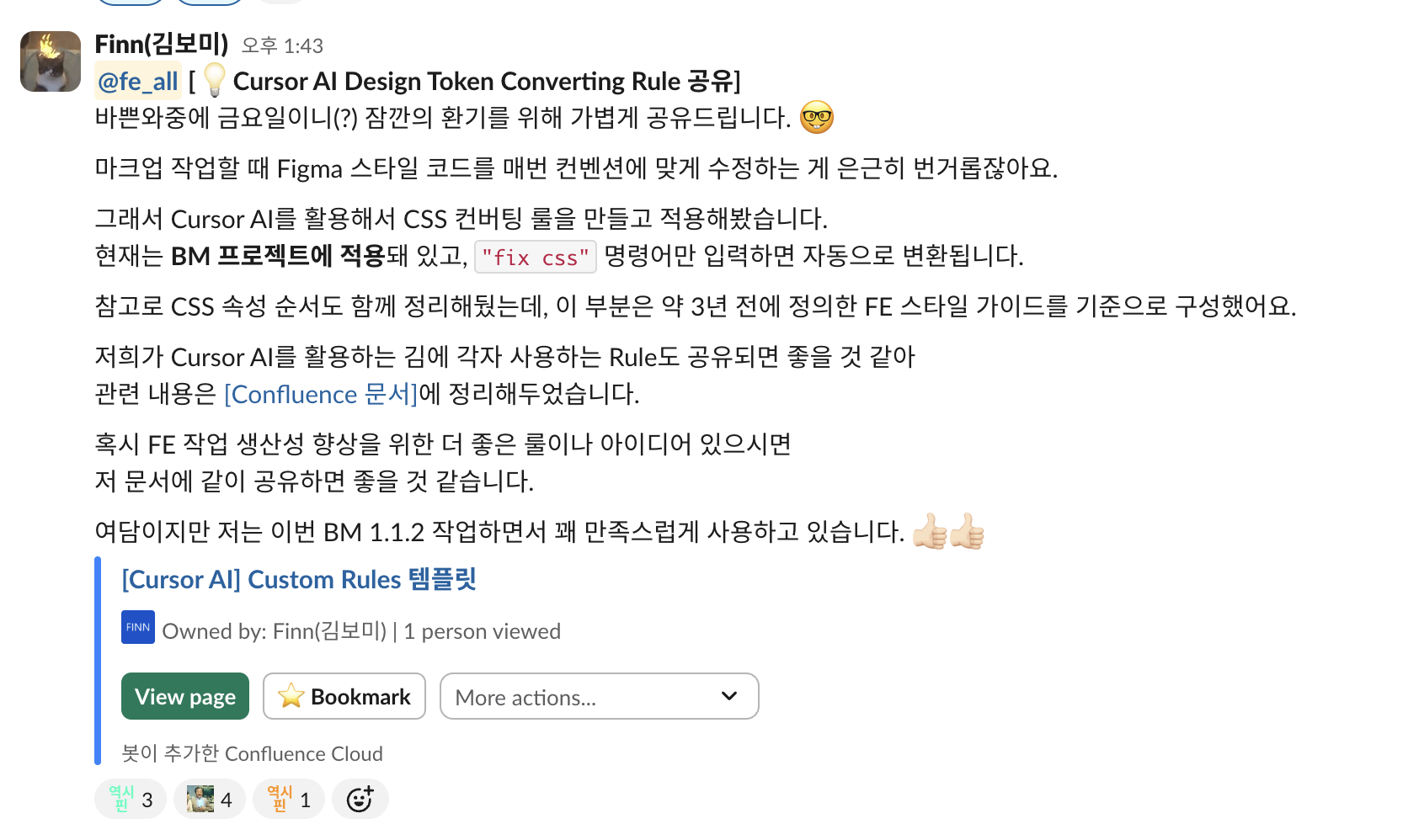 그래서 관련 내용을 내부 문서로 정리해 두고 Cursor AI를 사용하는 팀 내 다른 분들에게도 슬랙으로 공유했다.