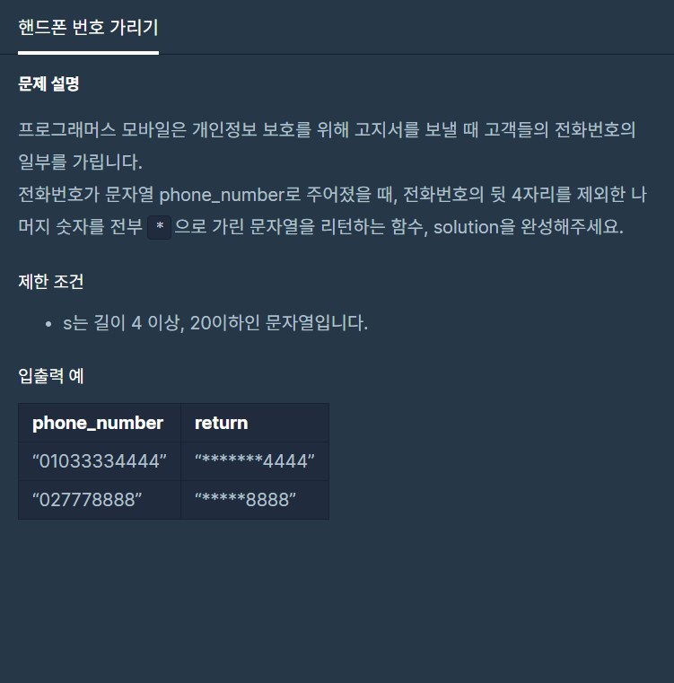String 배열 변수 num에 phone_number가 가지고 있는 값을 공백을 기준으로 잘라서 넣었습니다. 그 후 배열에 담긴 길이만큼 for문을 돌리고 그 안에서 전화번호 마지막 4자리를 남겨두는 조건(i<num.length-4)을 줬습니다. 그러면 해당 조건보다 작은 값들은 다 '*'로 나타나고 조건보다 큰 값이라면 charAt()을 사용해서 문장 중 해당 인덱스 위치에 해당하는 문자가 나타나게 했습니다.