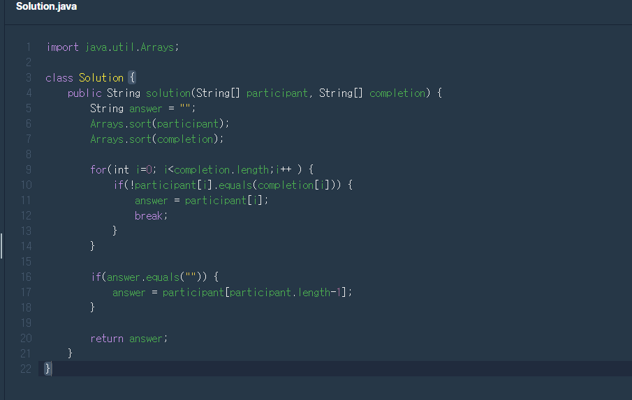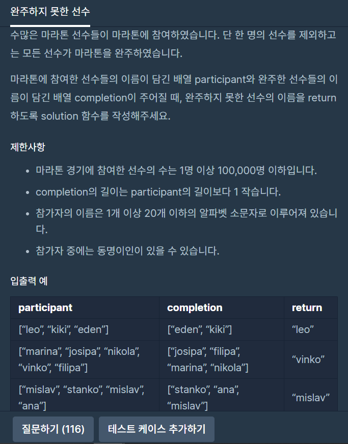 이 문제와 입출력 값을 딱 보자마자 '각 배열에 중복된 값이 있는지 검사를 해야겠다' 라는 생각이 먼저 들었습니다. 그래서 for문을 두 개 돌려서 값을 비교했습니다. 참여한 인원들을 조사할때 무조건 true값을 주었고, 참여한 사람이 완주한 사람의 값과 같다면 완주한 사람의 자리값을 null로 두고 false값을 주었습니다. 왜냐하면 return 되는 값은 중복된 값이 없는 사람의 이름이 나오기 때문입니다. 테스트는 통과했으나, 효율성 면에서는 0점을 받은 코드입니다.