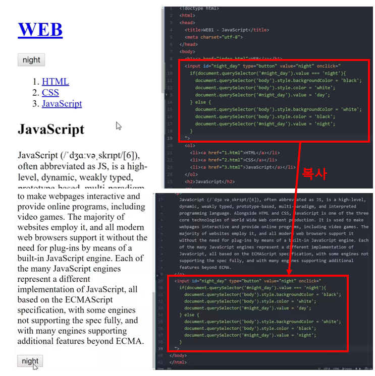 우선, Night 버튼 기능을 웹 페이지 하단에서도 동작하도록 해보자