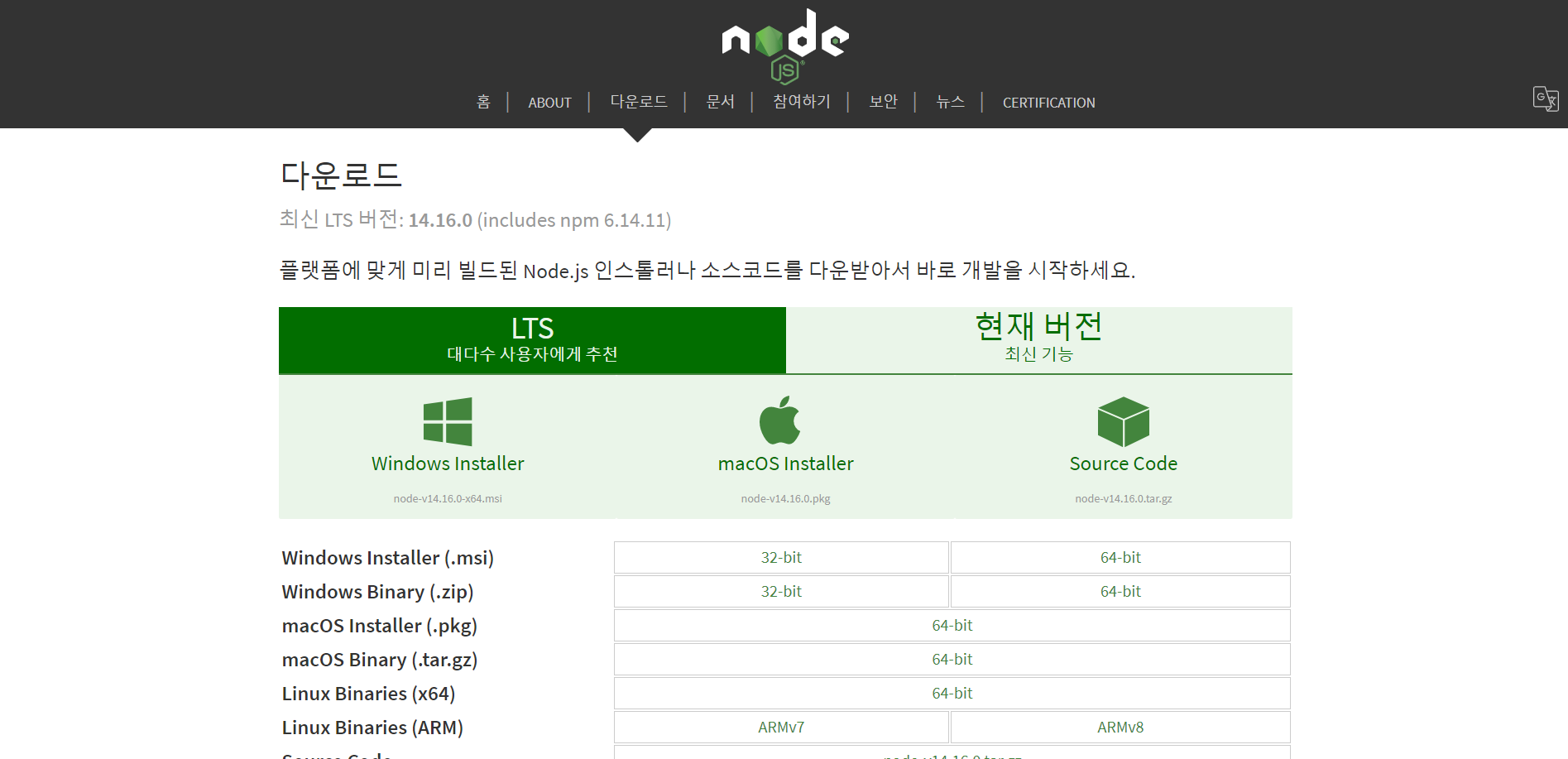 본인 운영체제 환경에 맞게 설치하면 된다. 최신 버전을 다운받아도 되지만, 안정화 등의 이유로 LTS 사용을 권장한다.