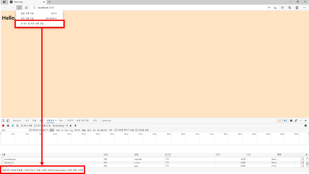 빈 캐시 및 하드 새로 고침 (=캐시 비우기 및 강력 새로고침) 버튼 클릭 후 네트워크 탭을 보면 단순 텍스트가 적힌 웹 페이지임에도 불구하고 1.7MB의 용량을 차지하고 있다.