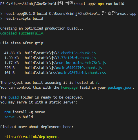 위 명령어를 수행하면 터미널에 아래와 같이 deployed 문구가 뜨고, build 디렉토리가 생성된 것을 볼 수 있다.
