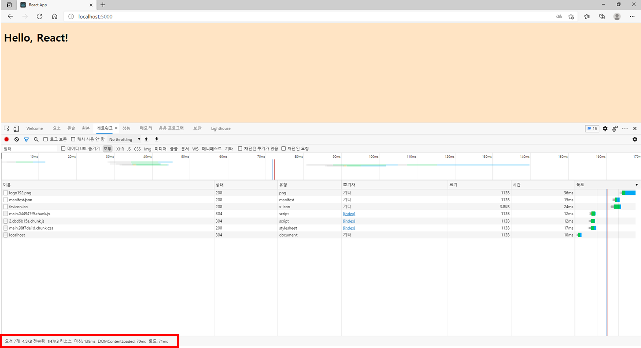 그 이유는 create-react-app으로 개발 환경을 구축할 때 개발의 편의성을 위해 여러 가지 기능을 자동으로 추가하기 때문이다. 그래서 위와 같이 불필요한 용량을 줄이기 위해 빌드를 하는 것이다.