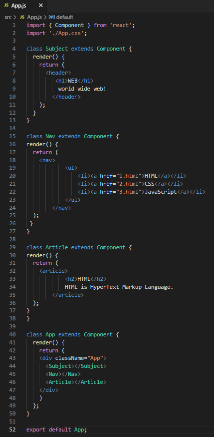 위의 코드를 간단하게 설명하자면 Subject 이름의 class를 만들고 리액트가 가진 Component 클래스를 상속받아서 새로운 클래스를 만드는 작업이다. (해당 클래스는 render()라는 메소드를 가지고 있다.)