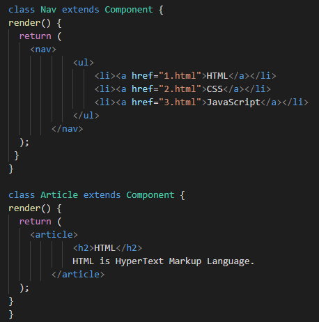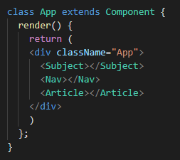 위의 코드를 간단하게 설명하자면 Subject 이름의 class를 만들고 리액트가 가진 Component 클래스를 상속받아서 새로운 클래스를 만드는 작업이다. (해당 클래스는 render()라는 메소드를 가지고 있다.)
