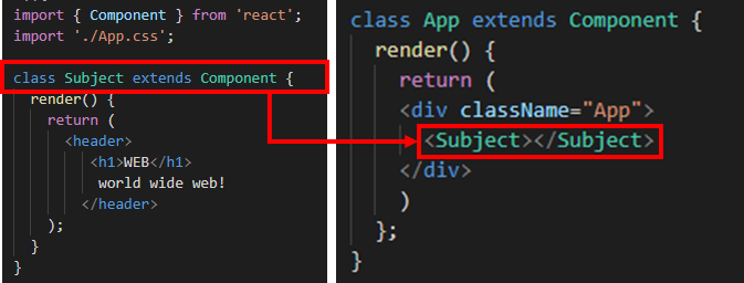 첫 번째, <header> 태그를 <Subject> 이름의 사용자 정의 태그로 변경해볼 것이다. 이때, 왼쪽과 같이 return 안에 Subject 이름의 태그로 사용할 html 코드를 넣어주면 된다. 이후, 적용 시 App 컴포넌트에 생성한 Subject 컴포넌트를 넣으면 된다.