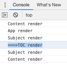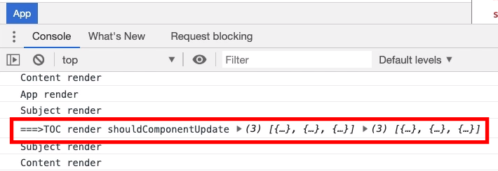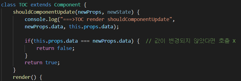 이는 효율적이지 않기 때문에 shouldComponentUpdate() 메소드를 사용해서 TOC 값이 바뀐 경우에만(조건) TOC 컴포넌트의 렌더 함수가 호출되도록 해볼 것이다.