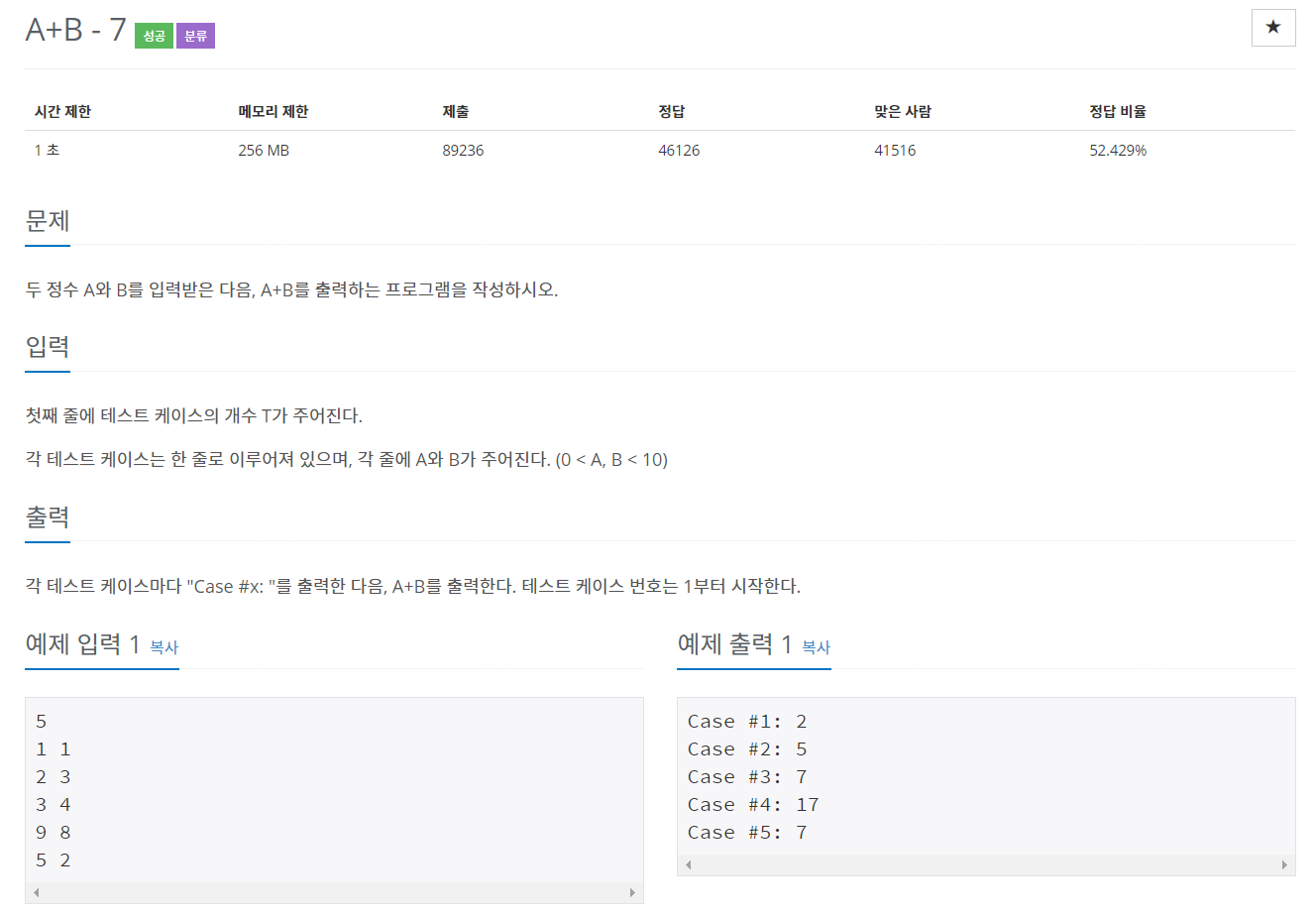 각 테스트 케이스마다 "Case #x: "를 출력한 다음, A+B를 출력한다. 테스트 케이스 번호는 1부터 시작한다.