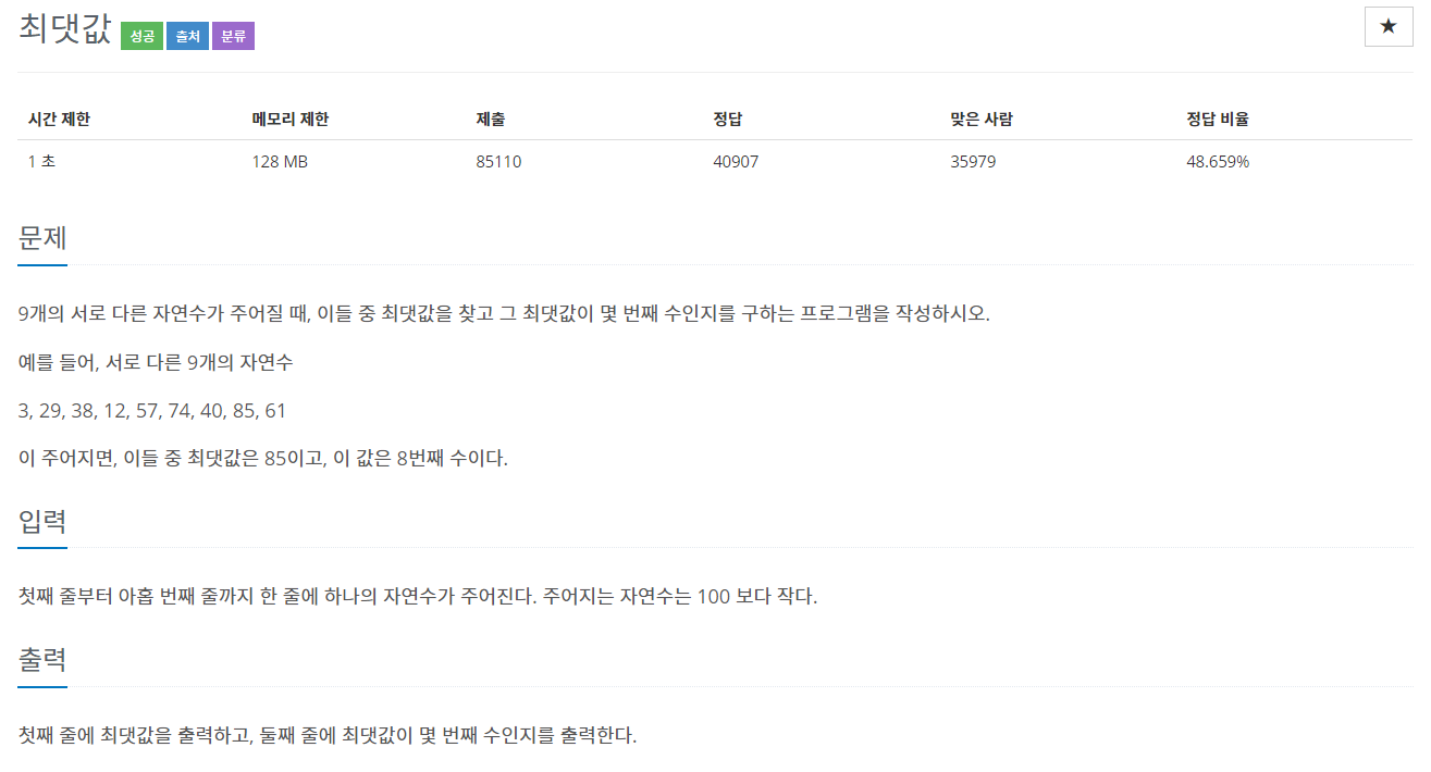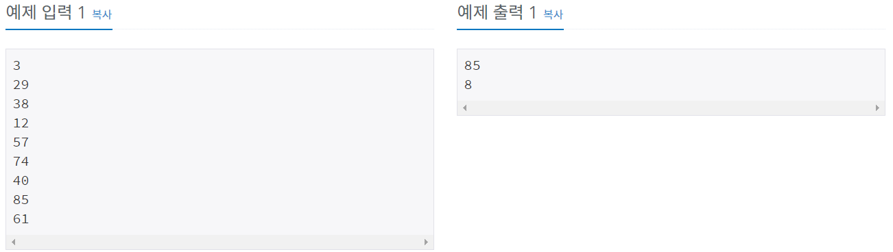 9개의 서로 다른 자연수가 주어질 때, 이들 중 최댓값을 찾고 그 최댓값이 몇 번째 수인지를 구하는 프로그램을 작성하시오. 예를 들어, 서로 다른 9개의 자연수 3, 29, 38, 12, 57, 74, 40, 85, 61 이 주어