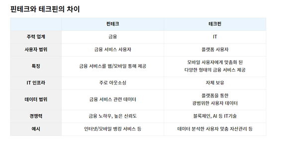핀 테크는 금융회사가 주도하여 금융에 IT기술을 접목시킨 서비스이며, 테크 핀은 IT기업이 주도하여 IT기술에 금융을 접목시킨 서비스이다. 즉, 핀 테크와 테크 핀은 어떤 기술을 접목시켰는지 주체에 따라 나뉜다. 우리가 흔히 쓰는 카카오페이는 테크 핀에 속한다고 한다.