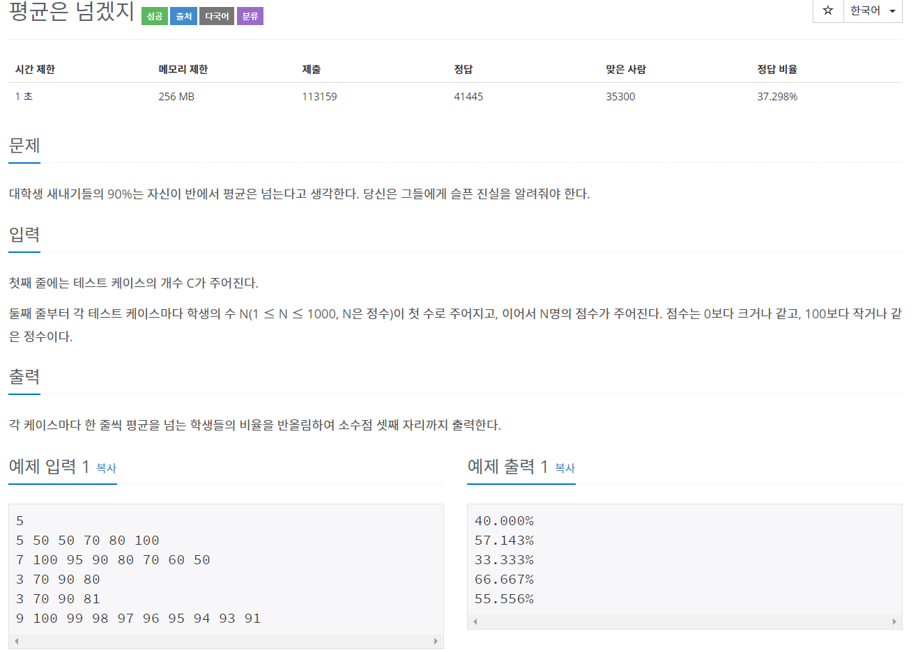 입력받은 테스트케이스 수 만큼 반복문을 돌리면서 배열에 성적을 저장하고, 동시에 누적 합을 같이 구해준다. 이후에 평균 성적을 구하고 배열에 저장된 성적들과 비교한 뒤 몇 명의 학생이 평균보다 높은지 카운트하면 된다.