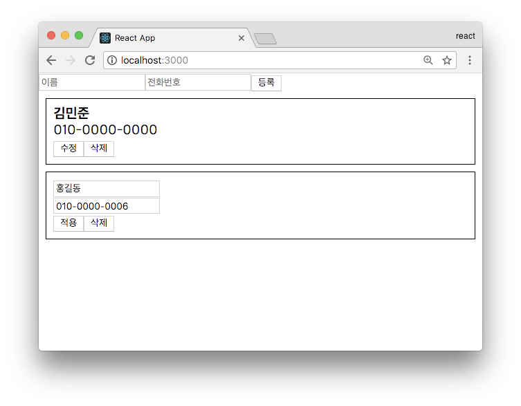 같은 원리로 handleUpdate라는 함수를 만들어 전화번호 정보를 수정해보자. 이 함수는 id와 data라는 파라미터를 받아와서 필요한 정보를 업데이트 해준다. 이 handleUpdate는 PhoneInfoList와 onUpdate로 전달해준다.