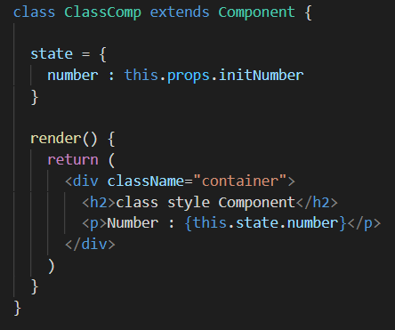 ① 클래스형 컴포넌트 : 클래스 내에 초기값을 설정해서 사용한다. state 값은 부모 컴포넌트(App.js)에서 받은 initNumber 값으로 초기화되었기 때문에 클래스형 컴포넌트에서 {this.state.number(=state의 속성명)}로 state 값을 사용할 수 있다. 또한, 오른쪽 이미지 같이 setState를 통해 state의 값을 변경할 수 있다.