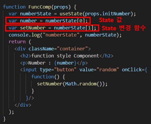 ② 함수형 컴포넌트 : 함수형 컴포넌트에서는 배열을 return 하는 내장 hook인 useState를 사용해서 state 값을 초기화한다. 또한, useState의 인자로 부모 컴포넌트로부터 전달받은 props 값을 사용한다. useState는 2개의 값을 가진 배열로 이루어져 있는데 첫 번째 값은 상태 값을 가지고, 두 번째 값은 상태값을 변경하는 함수이다.